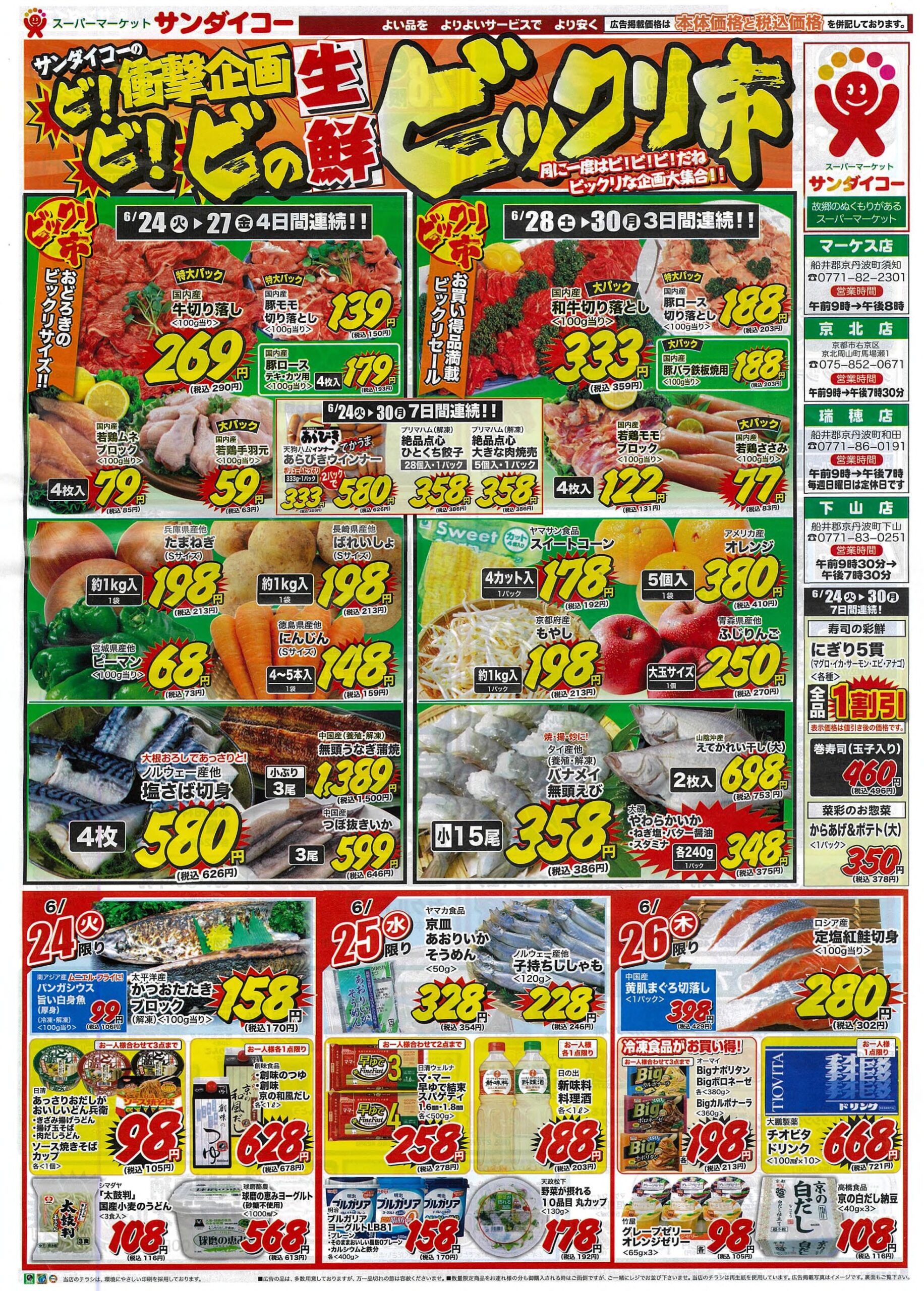 丹波マーケスは縦に長い京都府のほぼ真ん中、京丹波町の国道9号線沿いにある大型商業集積施設です。創業以来、町内外たくさんの方からご愛顧いただいています。まずはテナント会のページを開いて、入居しているテナントさんの様子をご覧ください。いろんなお店が揃っています。スタッフ一同皆様のご来店を心よりお待ちしています。 新着情報 12月の営業時間 フロアマップ キャッシュレス決済が可能なお店 左右にスクロールしてください。 未分類 サンダイコー下山店開店15周年大感謝祭 サンダイコーでは下山店開店15周年に合わ … 続きを読む 未分類 サンダイコーの衝撃企画/ビ!ビ!ビの生鮮ビックリ市 月に一度はビ!ビ!ビだね。サンダイコーマ … 続きを読む 未分類 サンダイコー大創業祭/スーパーセール第2弾 サンダイコーはおかげさまで56周年!日頃 … 続きを読む クリーニングホソミ クリーニングホソミ【オープンセール】を開催します。 皆さまお待ちかねの【クリーニングホソミ】 … 続きを読む サンダイコーマーケス店 サンダイコー大創業祭/スーパーセール第1弾 サンダイコーはおかげさまで56周年!日頃 … 続きを読む サンダイコーマーケス店 サンダイコー/ミルク&チーズフェア サンダイコーでは11月8日(土)~14日 … 続きを読む マーケスカレンダー 黄色で表示された日は、買い物支援バスのご予約を頂いている日です。 ※ 町内にお住まいの方は買物支援バスをご利用いただけます。詳しくは買い物支援バスチラシ 表面 裏面 ご覧ください。 PREV2025年 12月NEXT日月火水木金土3012345678910111213141516171819202122232425262728293031123 買物支援バス イベントコーナー出展者の情報です。