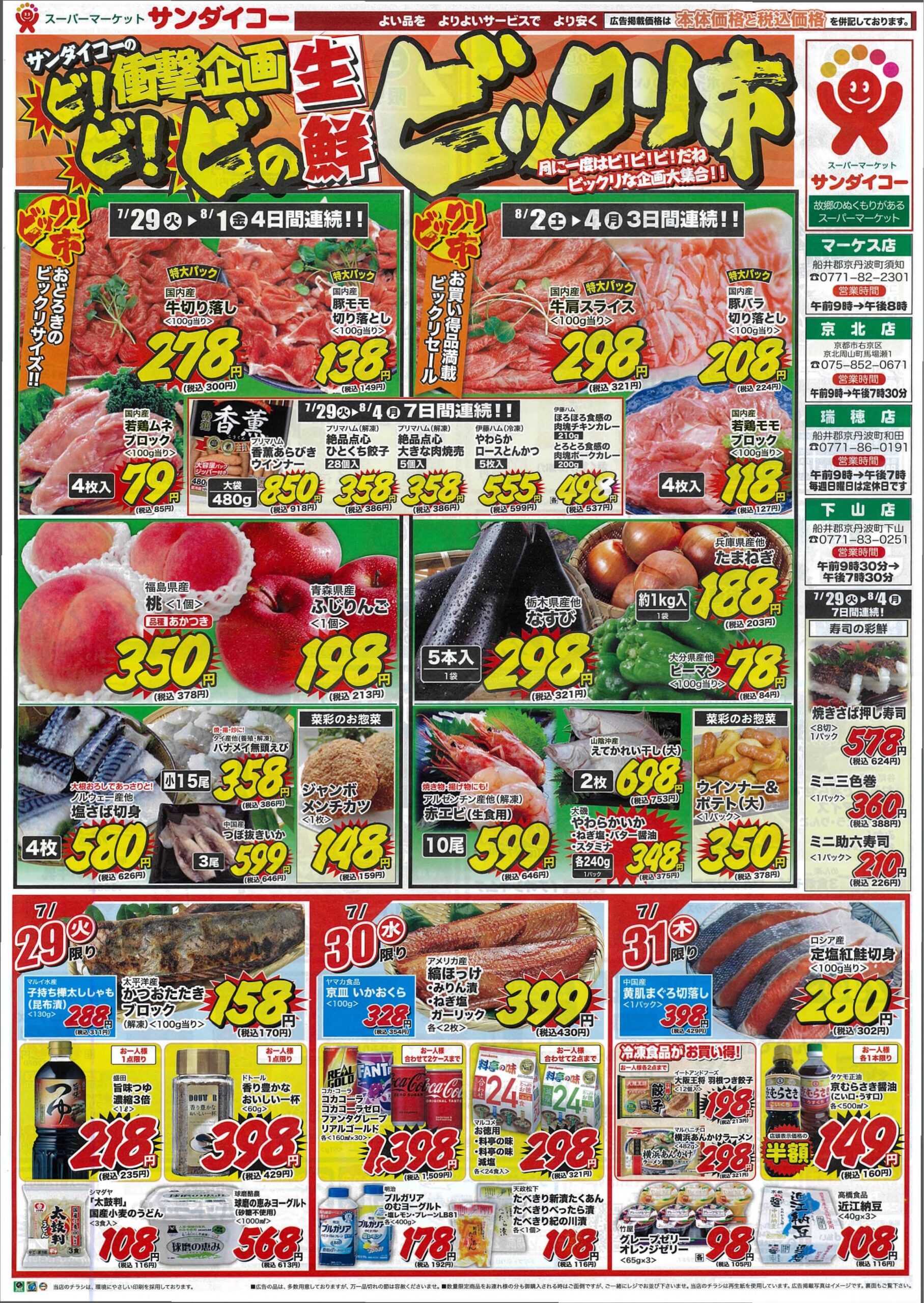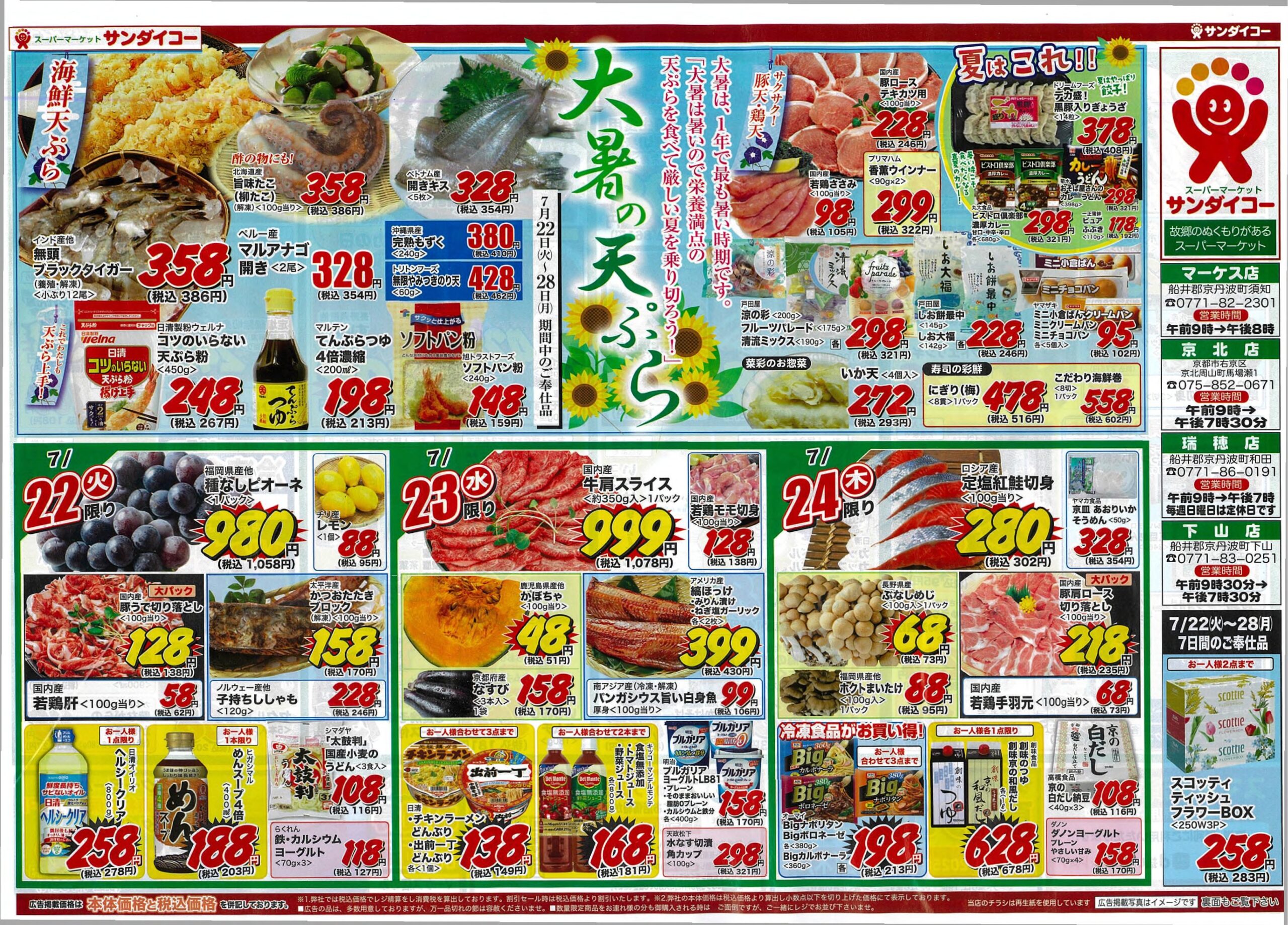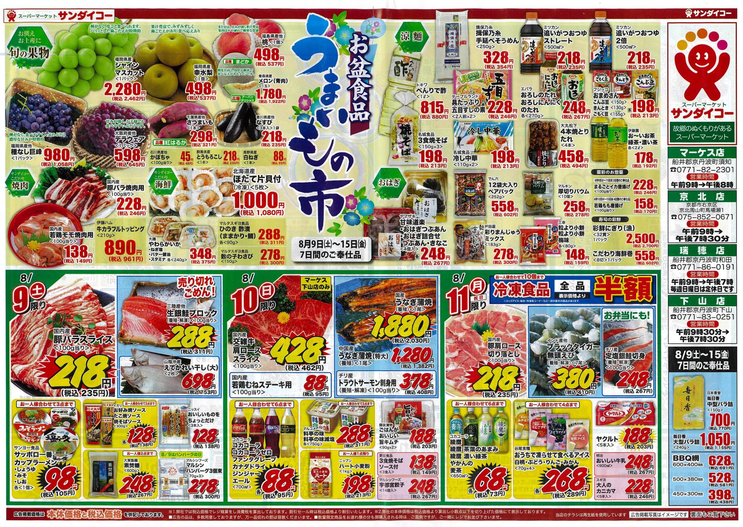 丹波マーケスは縦に長い京都府のほぼ真ん中、京丹波町の国道9号線沿いにある大型商業集積施設です。創業以来、町内外たくさんの方からご愛顧いただいています。まずはテナント会のページを開いて、入居しているテナントさんの様子をご覧ください。いろんなお店が揃っています。スタッフ一同皆様のご来店を心よりお待ちしています。 新着情報 12月の営業時間 フロアマップ キャッシュレス決済が可能なお店 左右にスクロールしてください。 サンダイコーマーケス店 サンダイコー・温かぽかぽかフェア サンダイコーでは【温かぽかぽかフェア】と … 続きを読む 未分類 サンダイコー下山店開店15周年大感謝祭 サンダイコーでは下山店開店15周年に合わ … 続きを読む 未分類 サンダイコーの衝撃企画/ビ!ビ!ビの生鮮ビックリ市 月に一度はビ!ビ!ビだね。サンダイコーマ … 続きを読む 未分類 サンダイコー大創業祭/スーパーセール第2弾 サンダイコーはおかげさまで56周年!日頃 … 続きを読む クリーニングホソミ クリーニングホソミ【オープンセール】を開催します。 皆さまお待ちかねの【クリーニングホソミ】 … 続きを読む サンダイコーマーケス店 サンダイコー大創業祭/スーパーセール第1弾 サンダイコーはおかげさまで56周年!日頃 … 続きを読む マーケスカレンダー 黄色で表示された日は、買い物支援バスのご予約を頂いている日です。 ※ 町内にお住まいの方は買物支援バスをご利用いただけます。詳しくは買い物支援バスチラシ 表面 裏面 ご覧ください。 PREV2025年 12月NEXT日月火水木金土3012345678910111213141516171819202122232425262728293031123 買物支援バス イベントコーナー出展者の情報です。