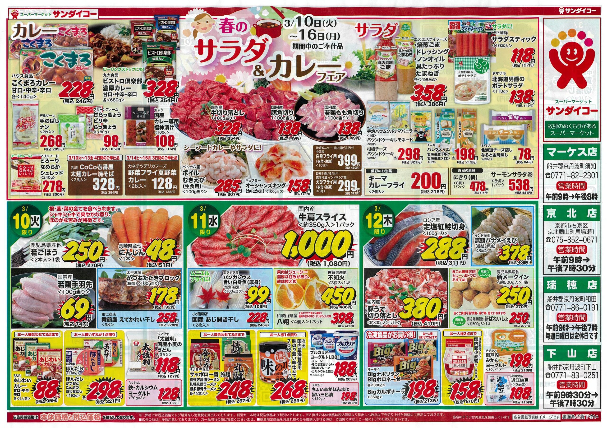 丹波マーケスは縦に長い京都府のほぼ真ん中、京丹波町の国道9号線沿いにある大型商業集積施設です。創業以来、町内外たくさんの方からご愛顧いただいています。まずはテナント会のページを開いて、入居しているテナントさんの様子をご覧ください。いろんなお店が揃っています。スタッフ一同皆様のご来店を心よりお待ちしています。 3月の営業時間 新着情報 サンダイコーマーケス店 サンダイコー・春のサラダ&カレーフェア サンダイコーでは3月10日(火)~16日 … 続きを読む サンダイコーマーケス店 \サンダイコーの/生活応援ど真ん中市 サンダイコーでは生活応援📣ど真ん中市を銘 … 続きを読む サンダイコーマーケス店 サンダイコー♫ハッピーフェスティバル♫ サンダイコーでは話題のブランドや産地、品 … 続きを読む サンダイコーマーケス店 サンダイコーの衝撃企画 ビ!ビ!ビの生鮮ビックリ市 月に一度はビ!ビ!ビだね。サンダイコーで … 続きを読む フラワーショップいずみ 卒業式のお花ご予約受付中 フラワーショップいずみでは卒業式のお花の … 続きを読む 未分類 2月22日は「おでんの日&カツカレーの日」 2月22日(日)はおでんの日&カツカレー … 続きを読む マーケスカレンダー PREV2026年 3月NEXT日月火水木金土1234567891011121314生活応援マルシェ1516171819202122232425262728チーム京丹波2930311234 イベントコーナー出店者の情報です。