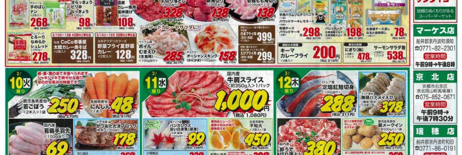 サンダイコーでは3月10日(火)~16日(月)の7日間、【春のサラダ&カレーフェア】と題して、食材を豊富にご用意してお客様のご来店をお待ちしております。 期間中の曜日ごとのお買い得情報はチラシをご覧ください。※ マーケス …