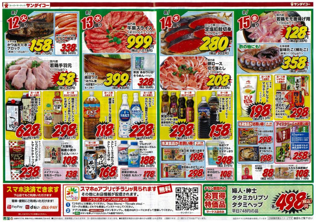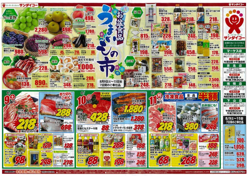 サンダイコー・お盆食品うまいもの市by tamba-markedsに 未分類on 投稿日: 2025年8月9日2025年8月8日 サンダイコーでは8月9日(土)~15日(金)の7日間、お盆食品うまいもの市と題して旬の果物から海鮮焼き肉まで、うまいものをを取り揃えご奉仕させて頂きます。冷凍食品全品半額としている日もありますので、詳しくはチラシをご覧の上お買い求めください。