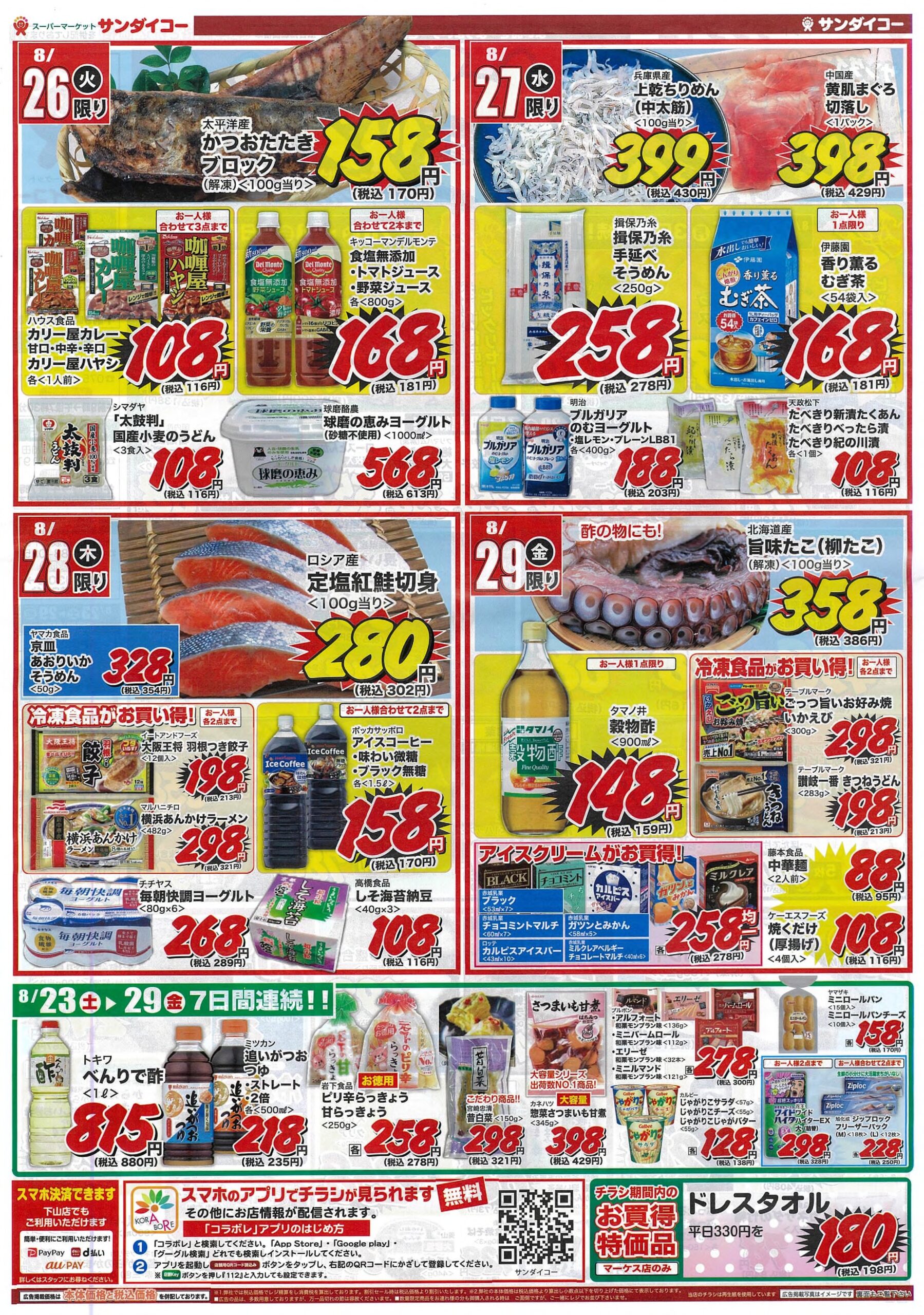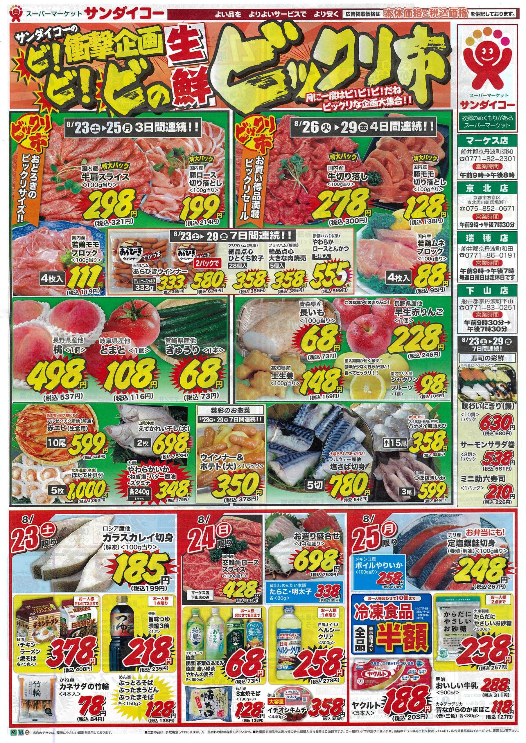 サンダイコーの衝撃企画・ビ!ビ!ビの生鮮ビックリ市by tamba-markedsに サンダイコーマーケス店on 投稿日: 2025年8月23日2025年8月23日 月に一度はビ!ビ!ビ!だね。ビックリな企画大集合!! サンダイコーでは恒例の月に一度の生鮮ビックリ市を23日(土)~29日(金)までの7日間開催させて頂きます。おどろきのビックリサイズ、お買い得商品満載のビックリセールです。是非この機会をご利用ください。 詳しくはチラシをご覧ください。