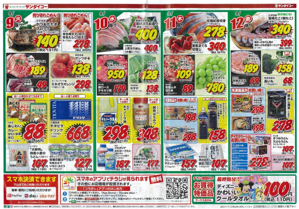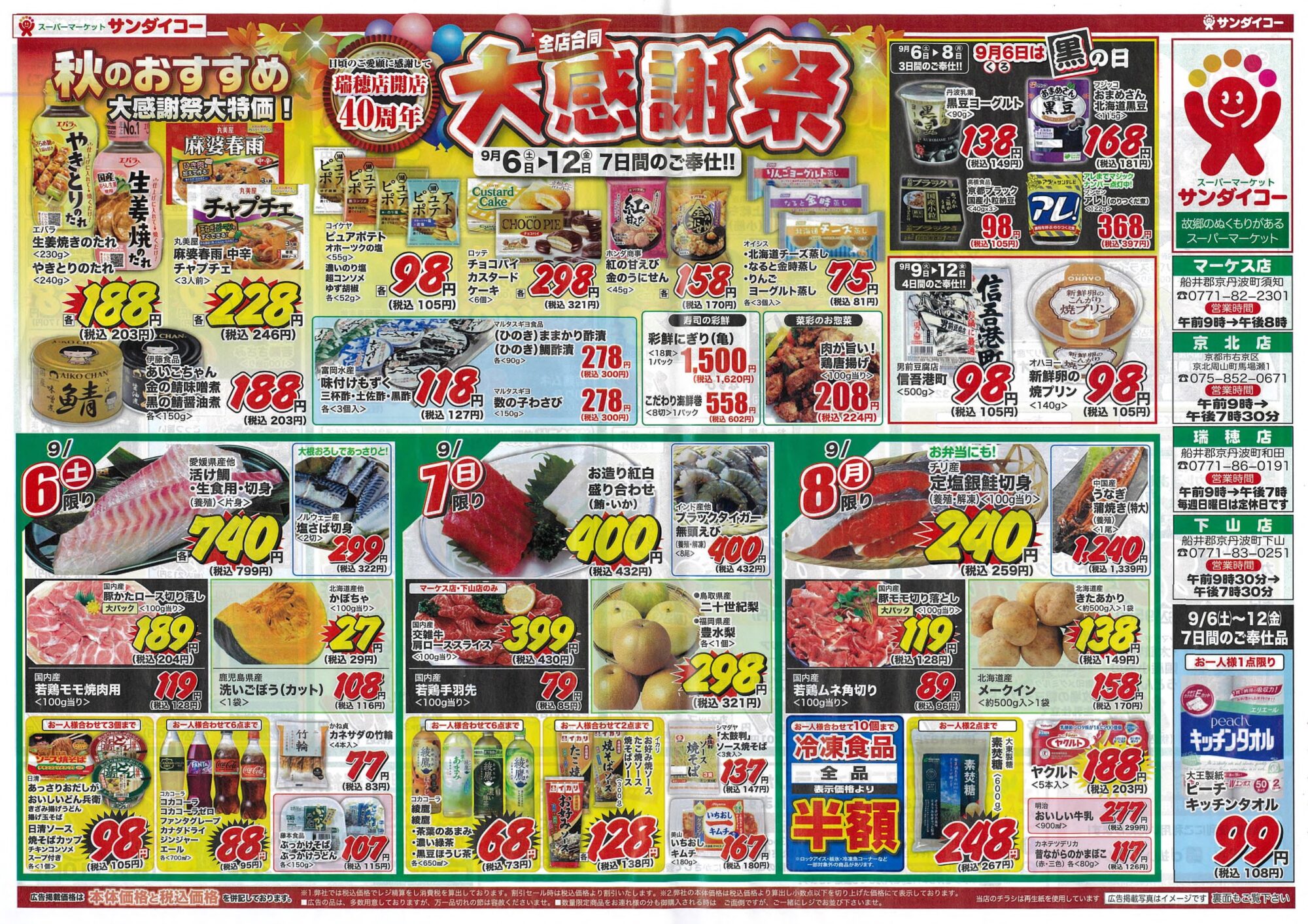 サンダイコー・瑞穂店開店40周年 全店合同大感謝祭by tamba-markedsに サンダイコーマーケス店on 投稿日: 2025年9月6日2025年9月9日 サンダイコーでは瑞穂店開店40周年を記念し、9月6日(土)~12日(金)の7日間、ご奉仕品を取り揃えて日頃ご愛顧の皆様に感謝の気持ちをお届けします。皆様のご来店をお待ちしております。 詳しくはチラシをご覧ください。