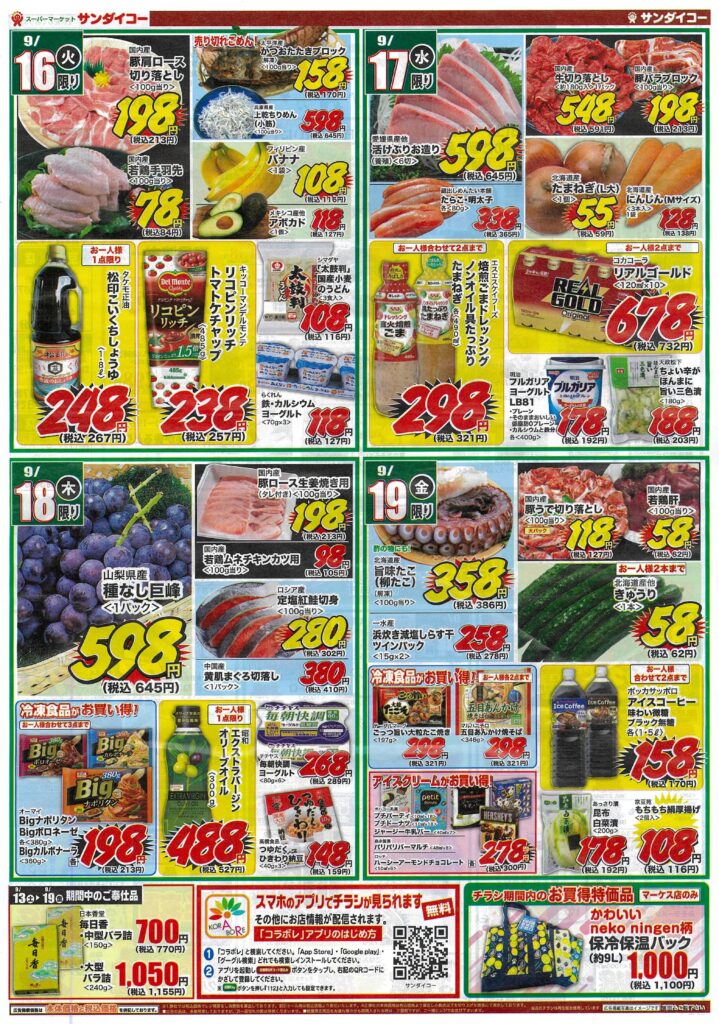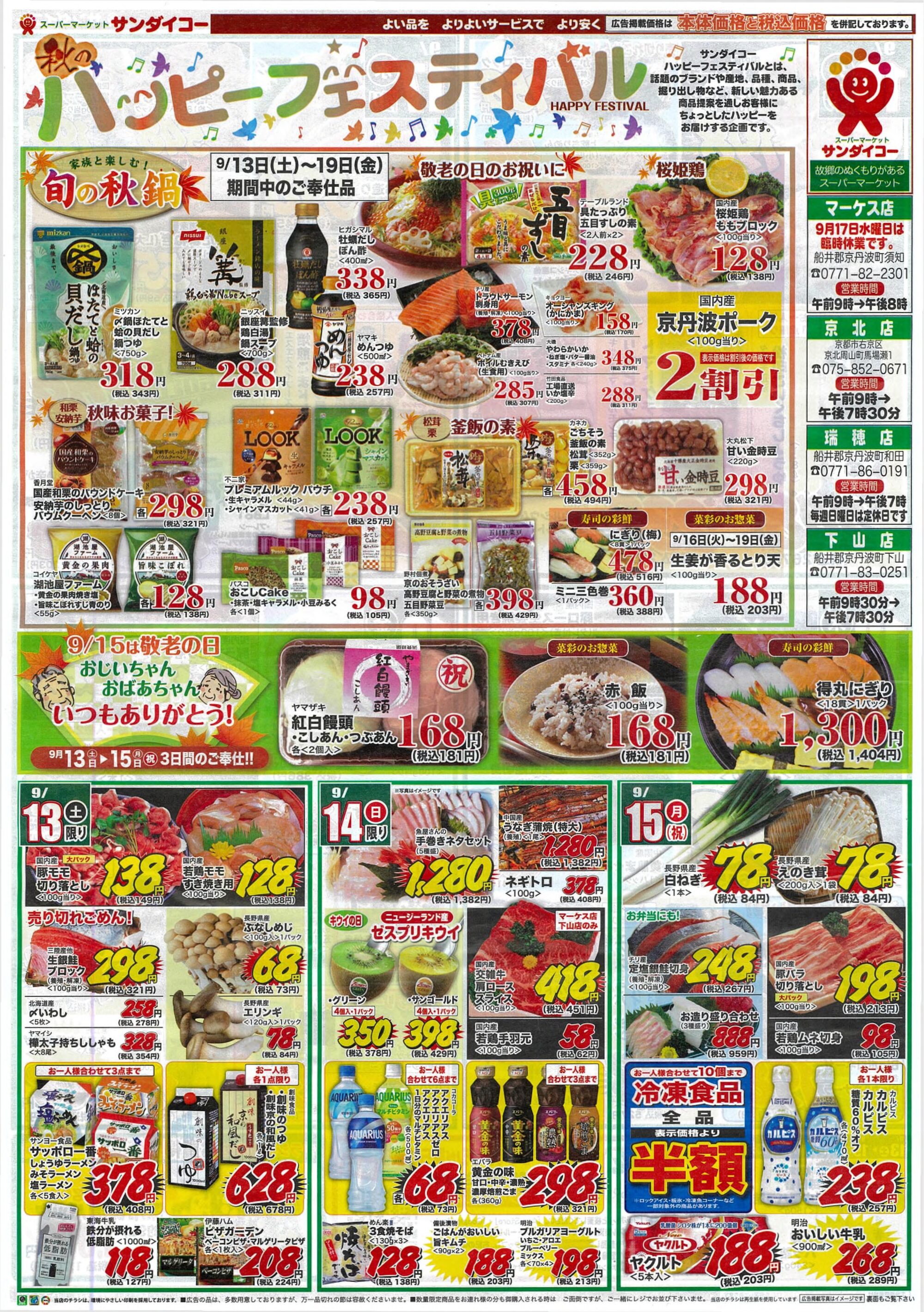 サンダイコー秋のハッピーフェスティバルby tamba-markedsに サンダイコーマーケス店on 投稿日: 2025年9月13日2025年9月12日 サンダイコーでは9月13日(土)~19日(金)にかけて、【秋のハッピーフェスティバル】と題して、旬の秋鍋用の食材や敬老の日のお祝いにご利用頂けるお惣菜など豊富にご用意させて頂きます。ご来店をお待ちしております。 詳しくはチラシをご覧ください。