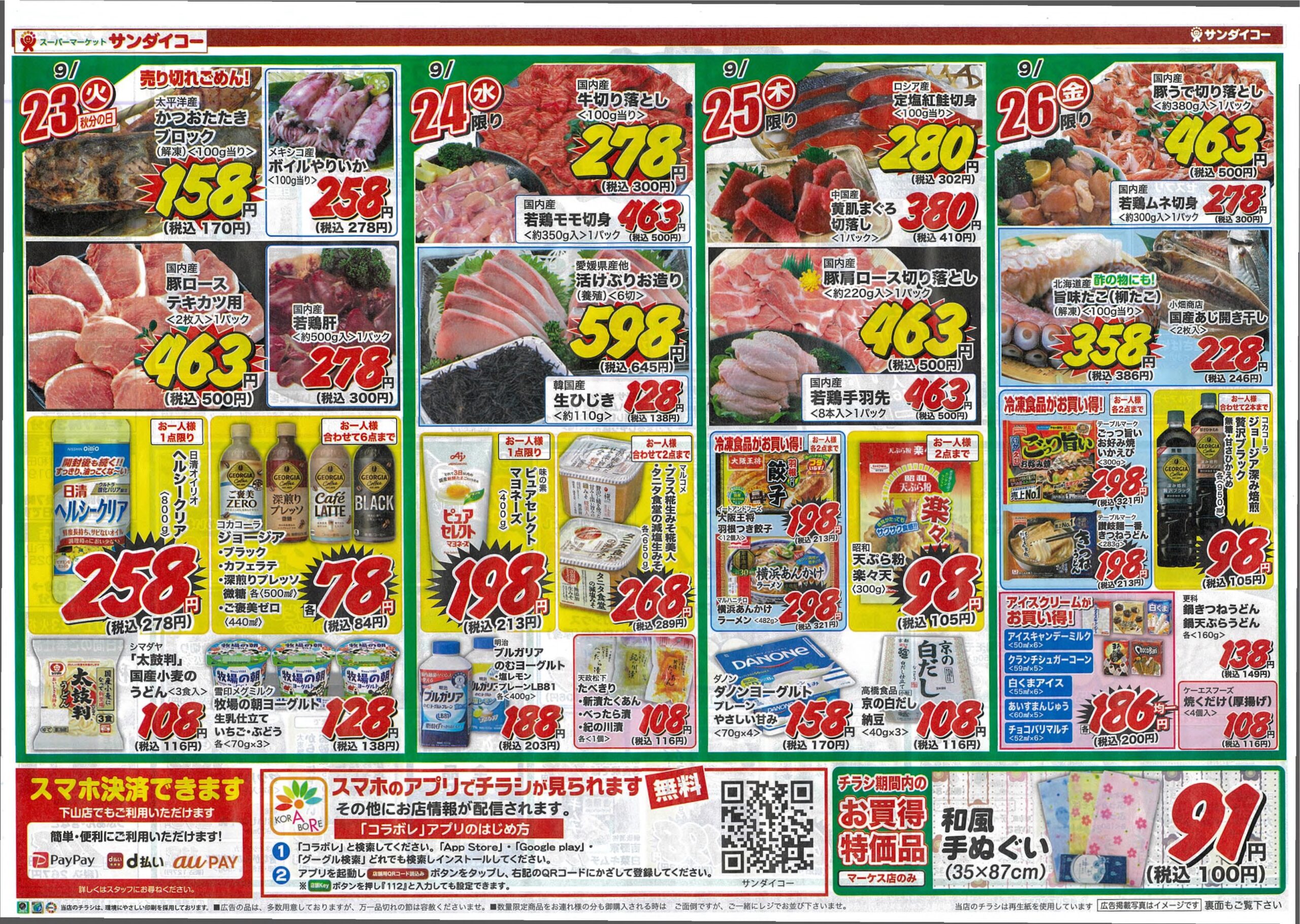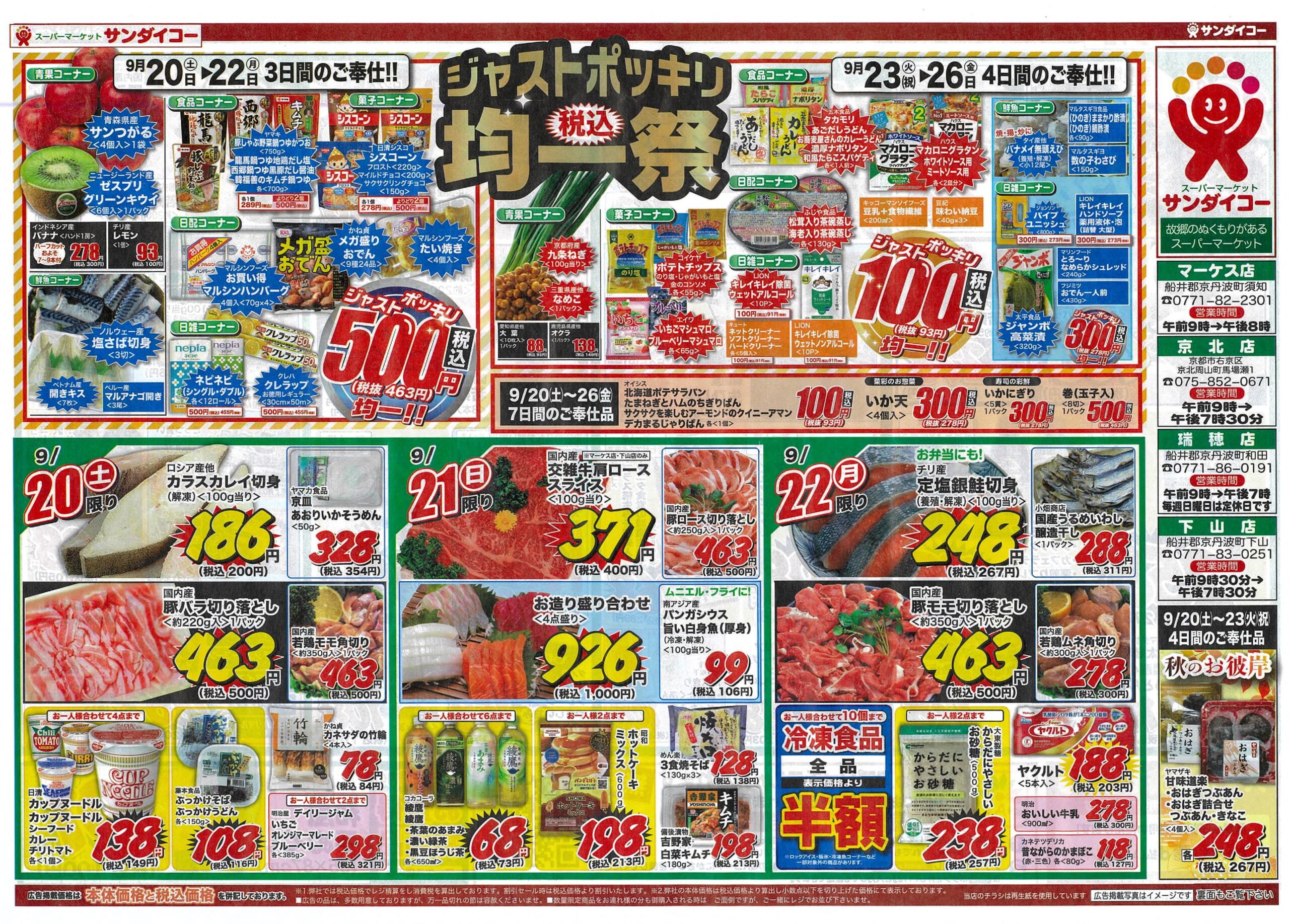 サンダイコー・ジャストポッキリ均一祭by tamba-markedsに 未分類on 投稿日: 2025年9月20日2025年9月20日 サンダイコーマーケス店ではジャストポッキリ均一祭として、9月20日(土)~22日(月)までの3日間はジャストポッキリ税込価格500円均一で、23日(火・祝)~26日(金)までの4日間はジャストポッキリ税込100円均一として青果、食品、菓子、日用雑貨あらゆる商品を取り揃えご奉仕させて頂きます。この機会を是非ともご利用ください。 詳しくはチラシをご覧ください。
