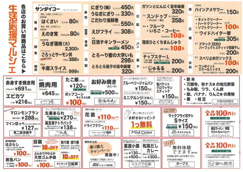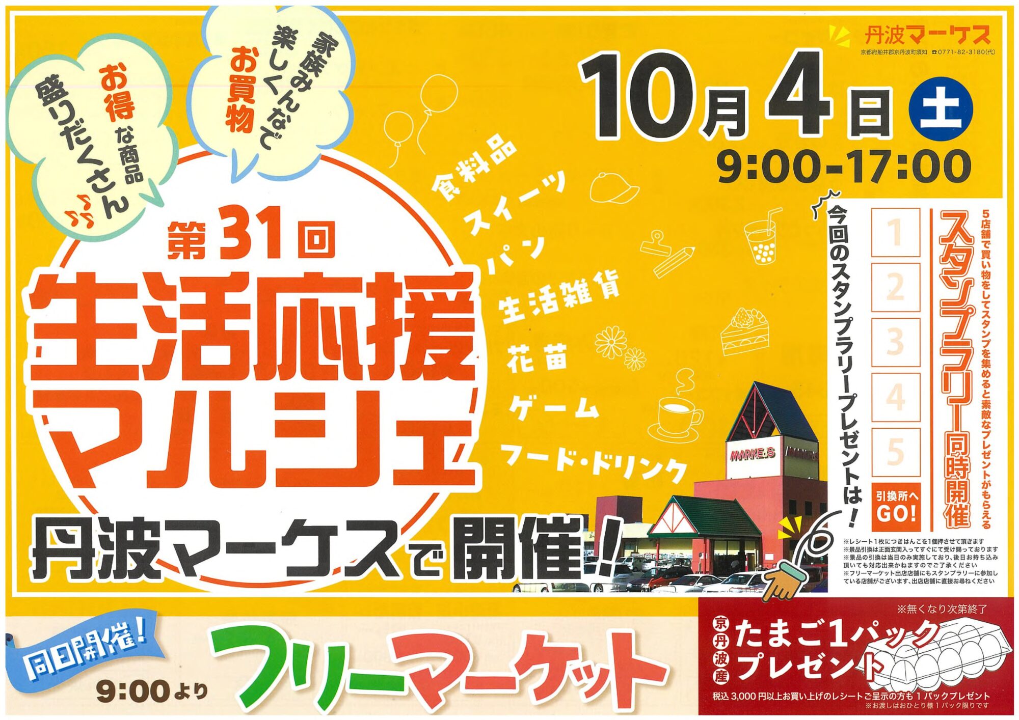 家族みんなで楽しくお買い物、お買い得な商品盛りだくさんの【丹波マーケス第31回生活応援マルシェ】を10月4日(土) 9:00~17:00 に開催します。店内5店舗でお買い物をしてスタンプを集めると素敵なプレゼントがもらえる「スタンプラリー」を同時開催します。各店舗でお買い物をされた際のレシート1枚につきハンコを1個押させて頂きます。景品の引換は正面玄関は行ってすぐの場所にて承っております。今回のスタンプラリープレゼントは、京丹波産のたまご1パックです。景品のは数に限りがあります。なくなり次第終了となりますので悪しからずご了承ください。※ 詳細は10月5日(日)の新聞折込チラシ(下記チラシ)をご覧ください。