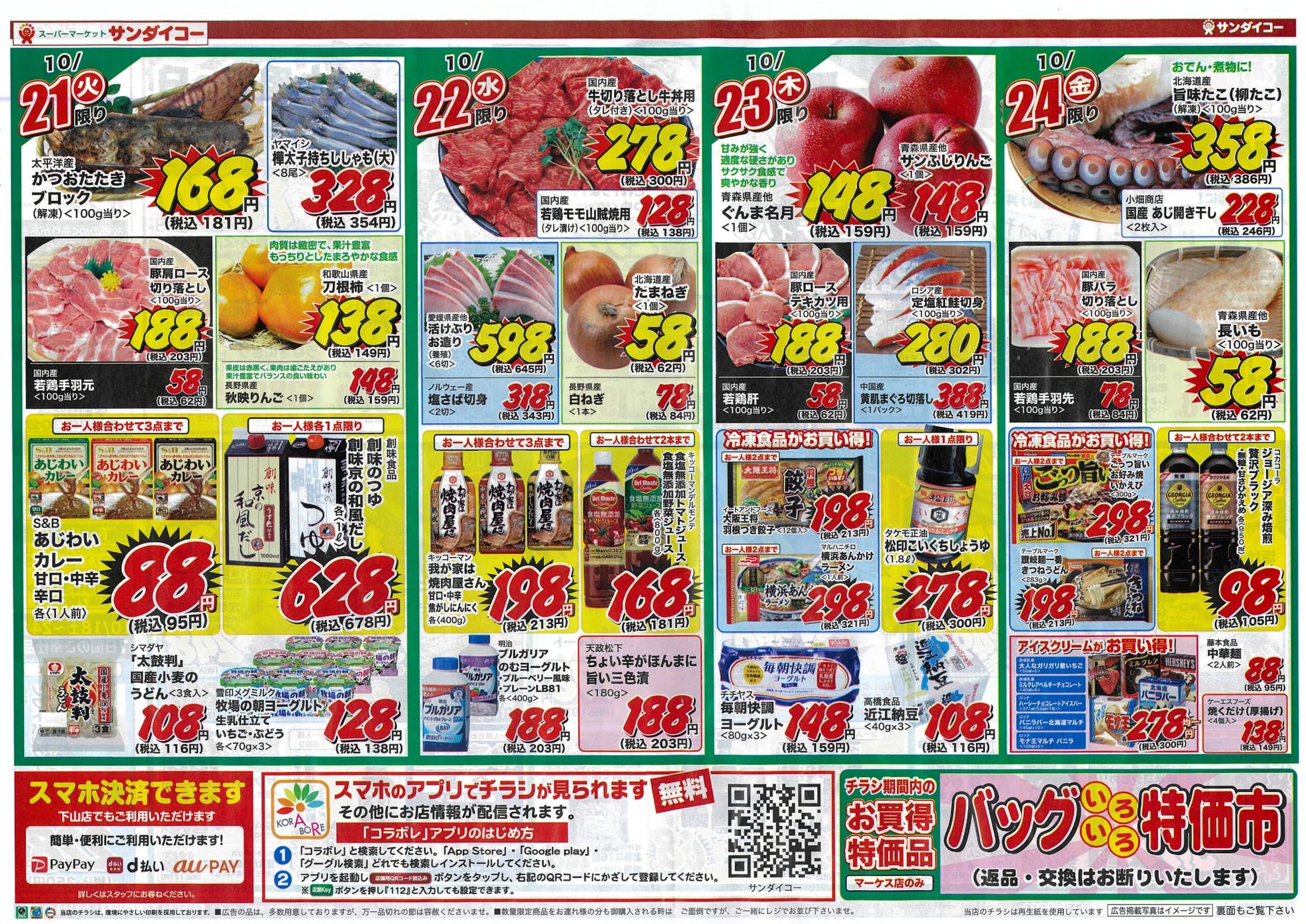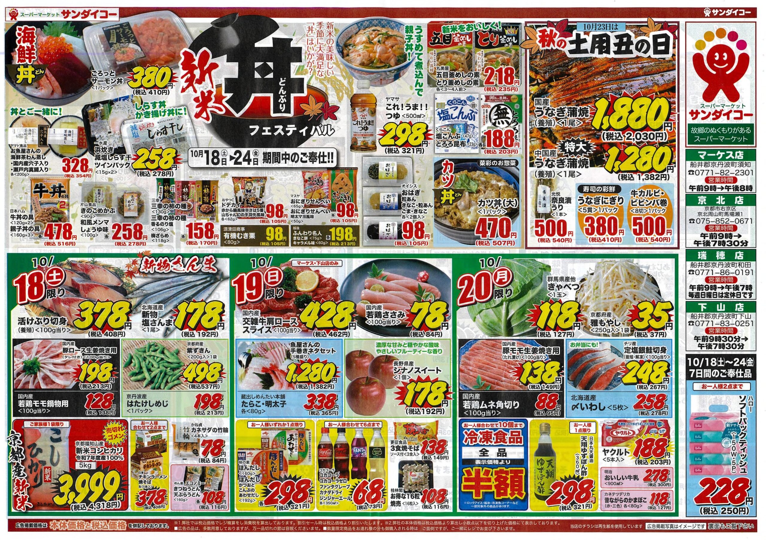 サンダイコー 新米どんぶりフェスティバルby tamba-markedsに サンダイコーマーケス店on 投稿日: 2025年10月18日2025年10月17日 サンダイコーマーケス店では、新米丼(どんぶり)フェスティバルと題して、新米のおいしい季節に大満足などんぶり🍚をお届けする様、豊富な食材を取り揃えております。18日(土)~24日(金)までのご奉仕となります。食欲の秋をおいしいどんぶりで満喫しましょう。 詳しくはチラシをご覧ください。