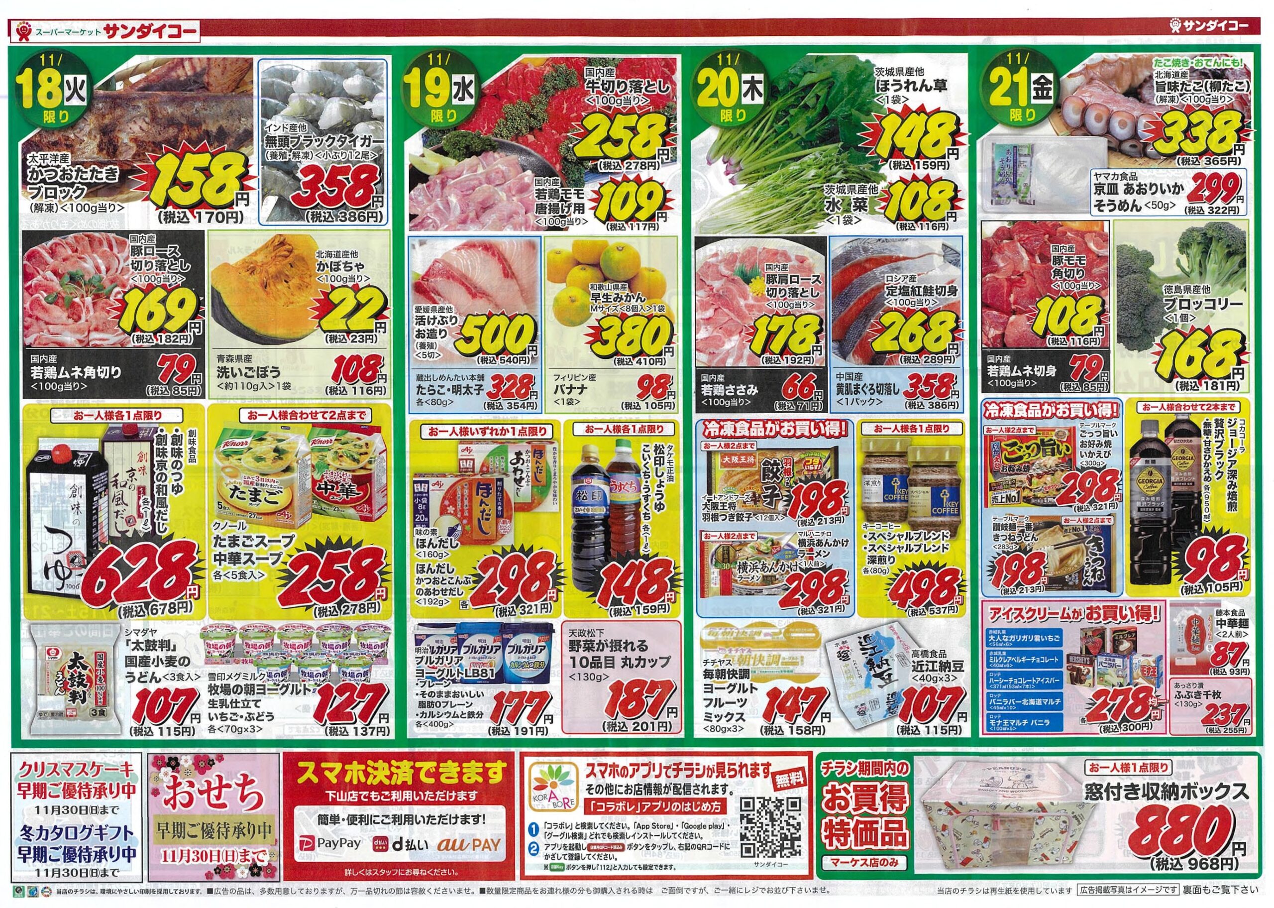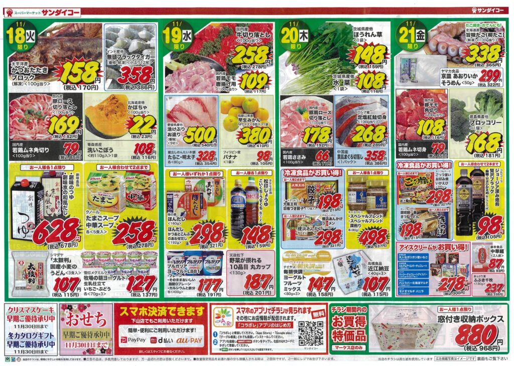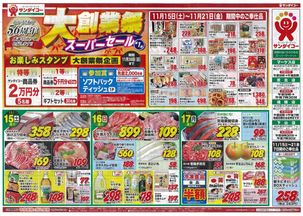 サンダイコー大創業祭/スーパーセール第1弾by tamba-markedsに サンダイコーマーケス店on 投稿日: 2025年11月15日2025年11月15日 サンダイコーはおかげさまで56周年!日頃ご愛顧の感謝を込めて大創業祭をお届けします。11月30日(日)までの期間、大創業祭企画として「お楽しみスタンプ」を実施します。特等はサンダイコー商品券2万円分を5名様に。1等は同じく商品券5千円分を10名様に。2等はギフトセットを30名様にご用意しています。期間中のご奉仕品も豊富に取り揃えています。是非この機会をご利用ください。