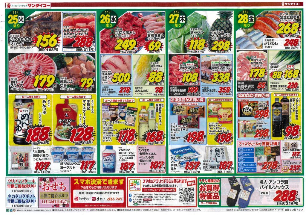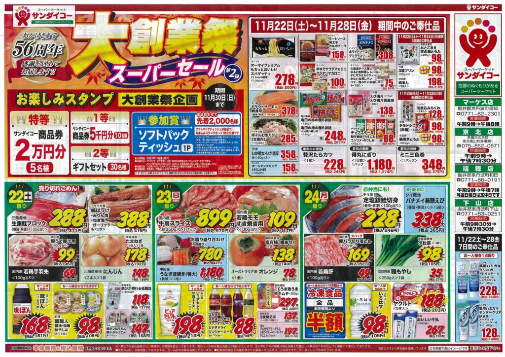 サンダイコー大創業祭/スーパーセール第2弾by tamba-markedsに 未分類on 投稿日: 2025年11月22日2025年11月22日 サンダイコーはおかげさまで56周年!日頃ご愛顧の感謝を込めて大創業祭スーパーセールをお届けします。11月30日(日)までの期間、大創業祭企画として「お楽しみスタンプ」を実施します。特等はサンダイコー商品券2万円分を5名様に。1等は同じく商品券5千円分を10名様に。2等はギフトセットを30名様にご用意しています。期間中のご奉仕品も豊富に取り揃えています。是非この機会をご利用ください。