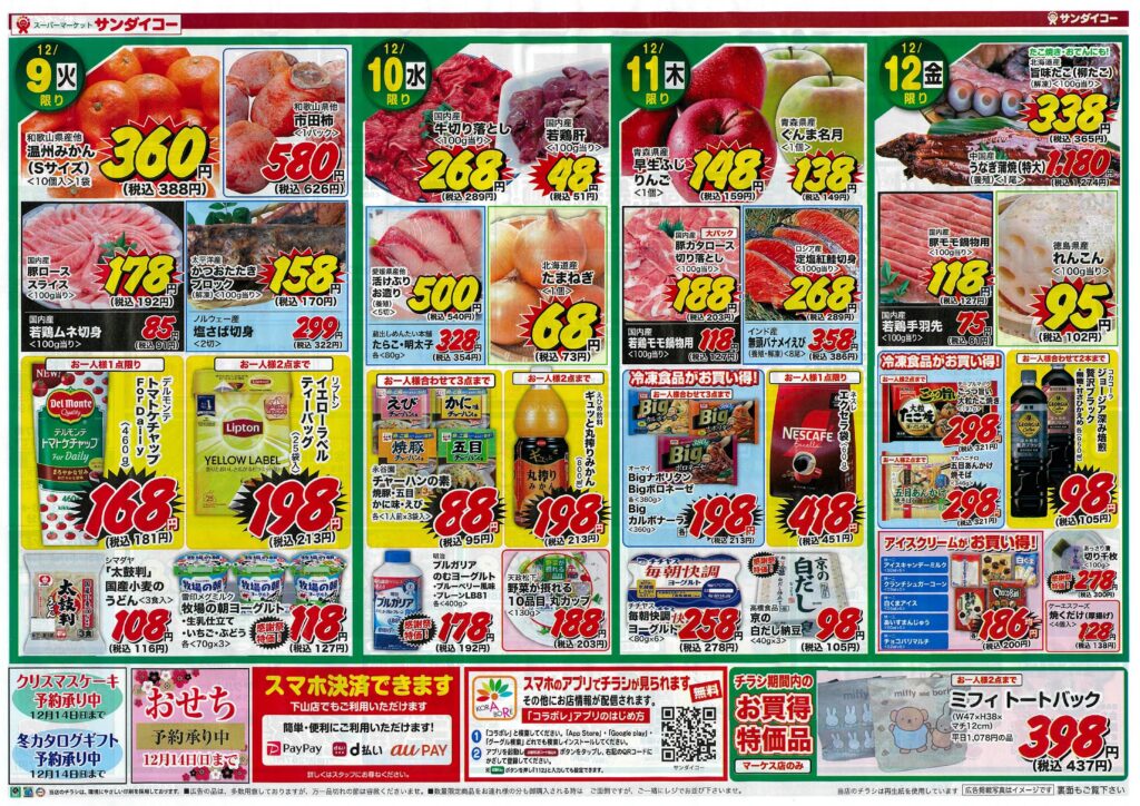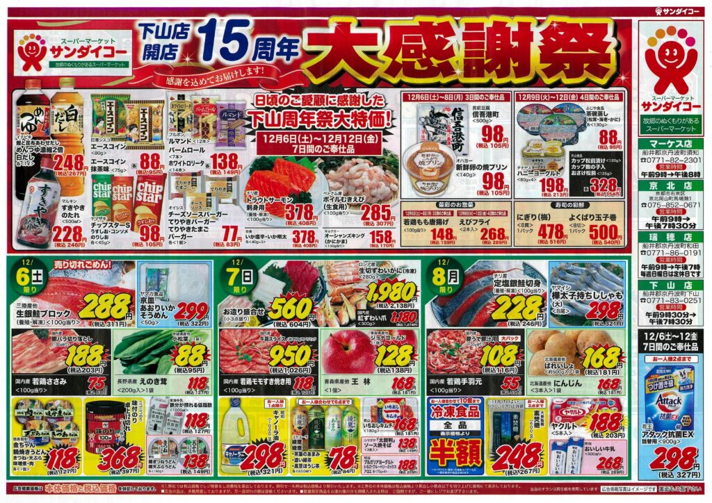 サンダイコー下山店開店15周年大感謝祭by tamba-markedsに 未分類on 投稿日: 2025年12月6日2025年12月5日 サンダイコーでは下山店開店15周年に合わせ12月6日(土)~12月12日(金)にかけて大感謝祭を開催します。ご奉仕品を豊富に取り揃え皆様のご来店をお待ちしています。 サンダイコーでは、12月14日(日)まで、クリスマスケーキ、おせちの、冬カタログギフトの予約を承っております。ご来店の際お申し付けください。