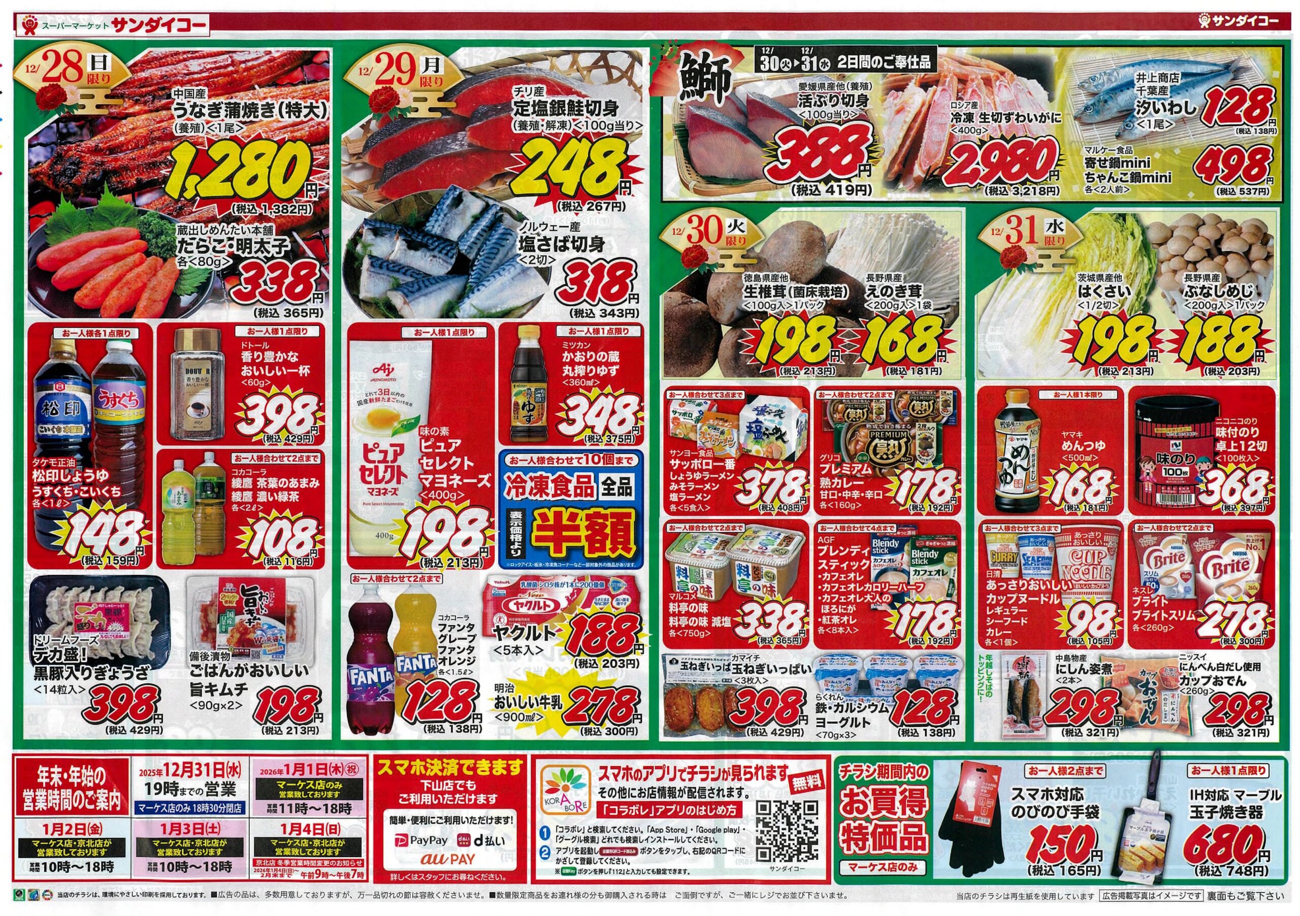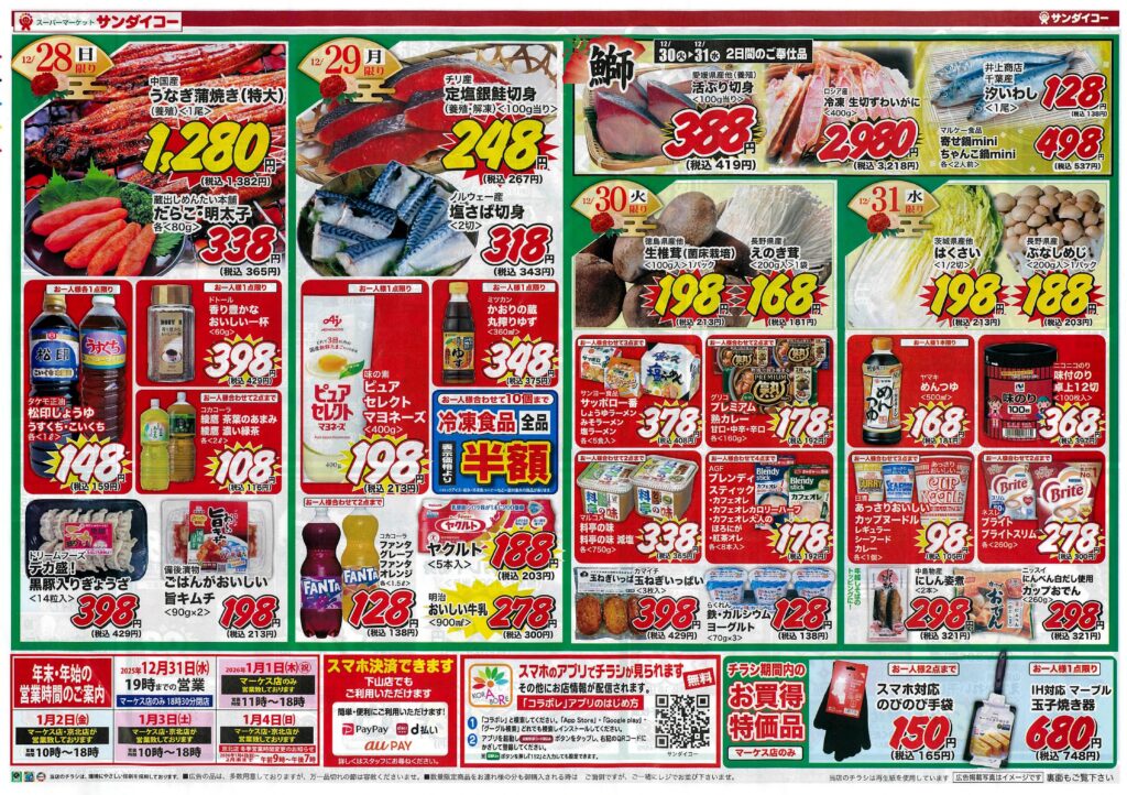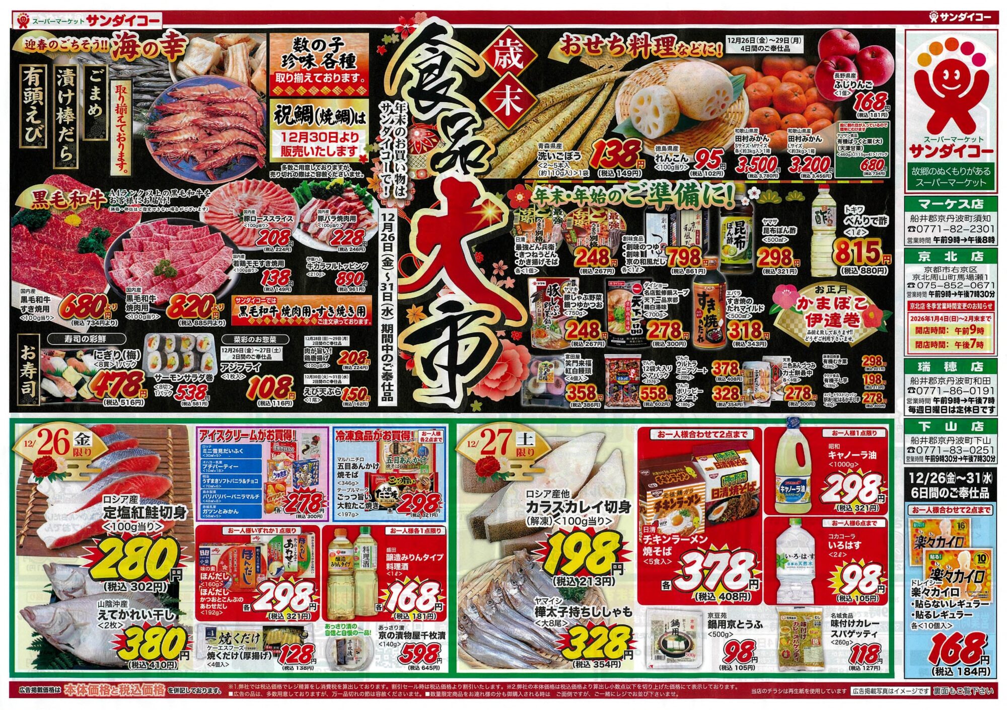 サンダイコー/歳末食品大市by tamba-markedsに サンダイコーマーケス店on 投稿日: 2025年12月26日2025年12月25日 サンダイコーマーケス店では迎春のごちそうを豊富に取り揃え、皆様のご来店をお待ちしています。年末年始帰省されるお子さんやお孫さんと楽しい食卓を囲んでください。※ サンダイコーマーケス店は元旦も休まず営業したします。(元旦の営業時間は11時~18時)急なお客様の訪問の際にもご安心ください。 ※ 詳しくはチラシをご覧ください。