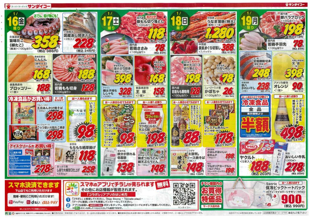 サンダイコー大感謝祭・決算スーパーセール第1弾by tamba-markedsに サンダイコーマーケス店on 投稿日: 2026年1月13日2026年1月13日 サンダイコーマーケス店では、13日(火)~19日(月)までの7日間、大感謝祭・決算スーパーセール第1弾と題して、ご奉仕品を多数取り揃え皆様のご来店をお待ちしています。期間中のお買い得商品の情報はチラシをご覧ください。