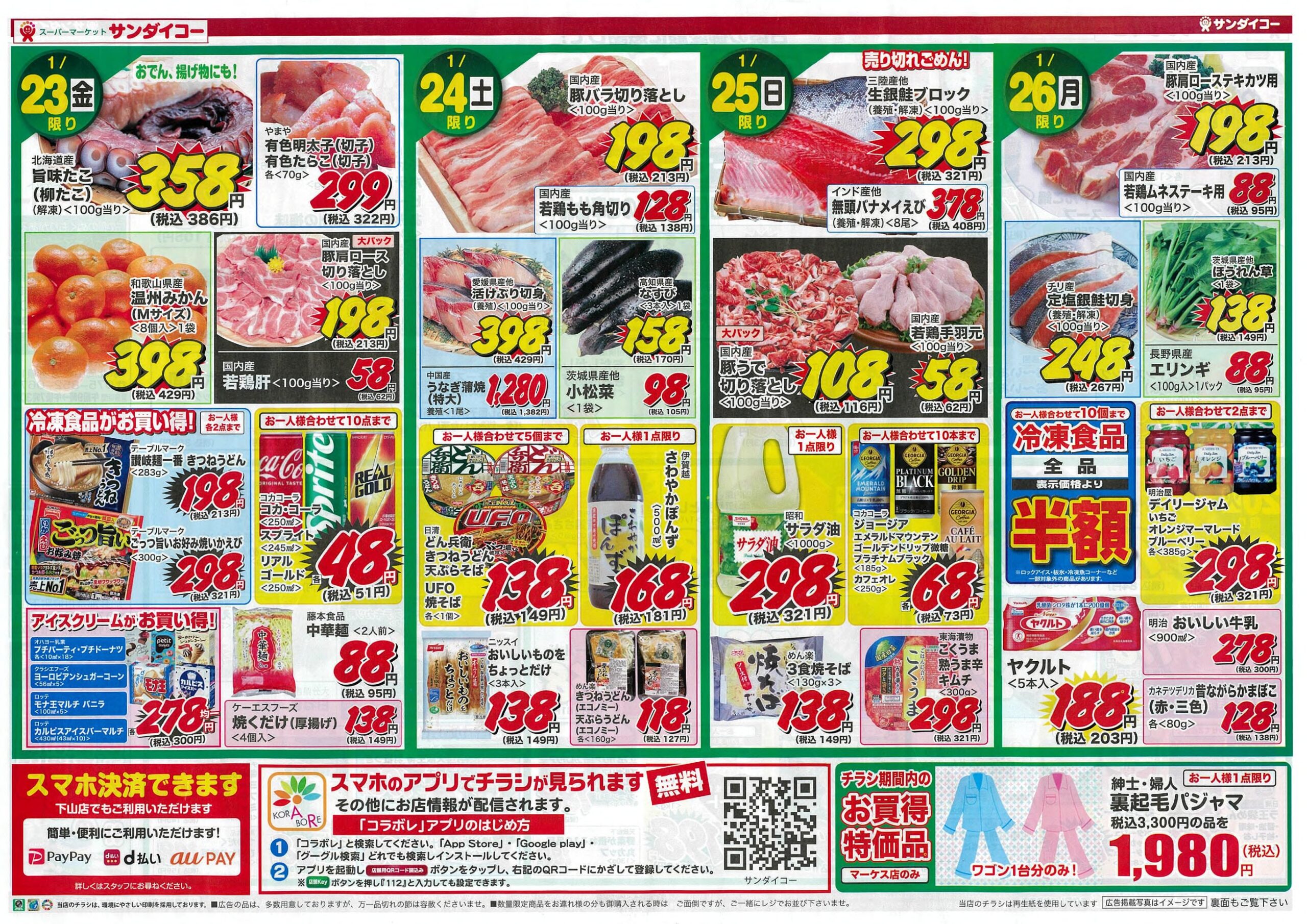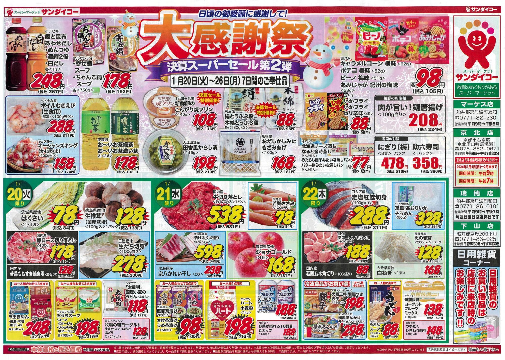 サンダイコー大感謝祭・決算スーパーセール第2弾by tamba-markedsに サンダイコーマーケス店on 投稿日: 2026年1月23日2026年1月27日 サンダイコーマーケス店では、日頃のご愛顧に感謝して!大感謝祭・決算スーパーセール第2弾を開催します。期間は1月20日(火)~26日(月)までの7日間。期間中お買い得商品を豊富に取り揃えご来店をお待ちしています。紳士・婦人 裏起毛パジャマをお一人様1点限りお買い得特価品としてご用意しています。チラシ期間内のみとなりますのでお早めにお買い求めください。 詳しくはチラシをご覧ください。