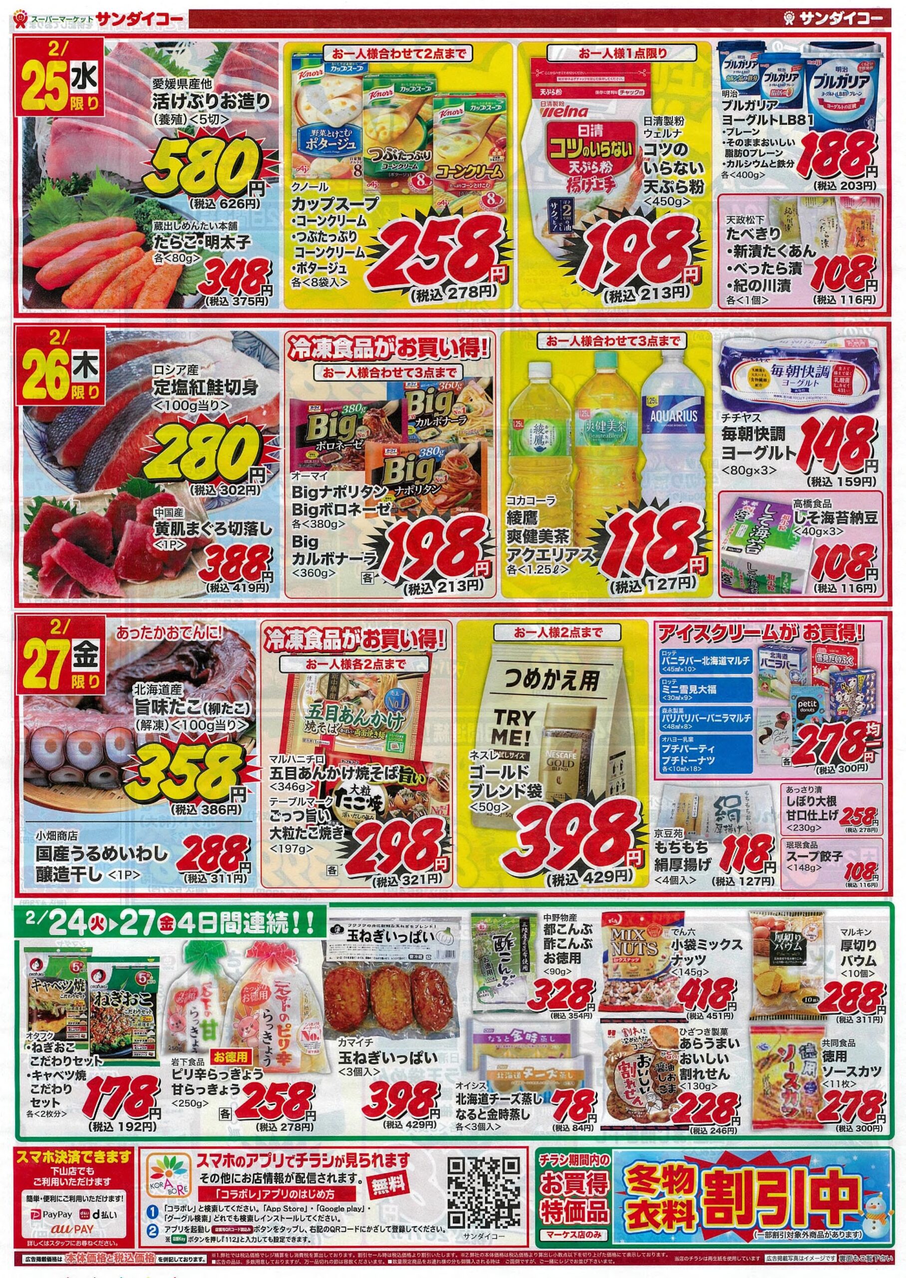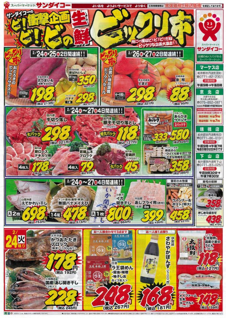 サンダイコーの衝撃企画 ビ!ビ!ビの生鮮ビックリ市by tamba-markedsに サンダイコーマーケス店on 投稿日: 2026年2月24日2026年2月23日 月に一度はビ!ビ!ビだね。サンダイコーでは、24日(火)・25日(水)の2日間、おどろきのビックリサイズで、26日(木)・27日(金)は果物中心に、24日(火)~27日(金)は4日間通してお肉やお魚といった生鮮食品をビックリのお買い得価格でご奉仕させて頂きます。 詳しくはチラシをご覧ください。