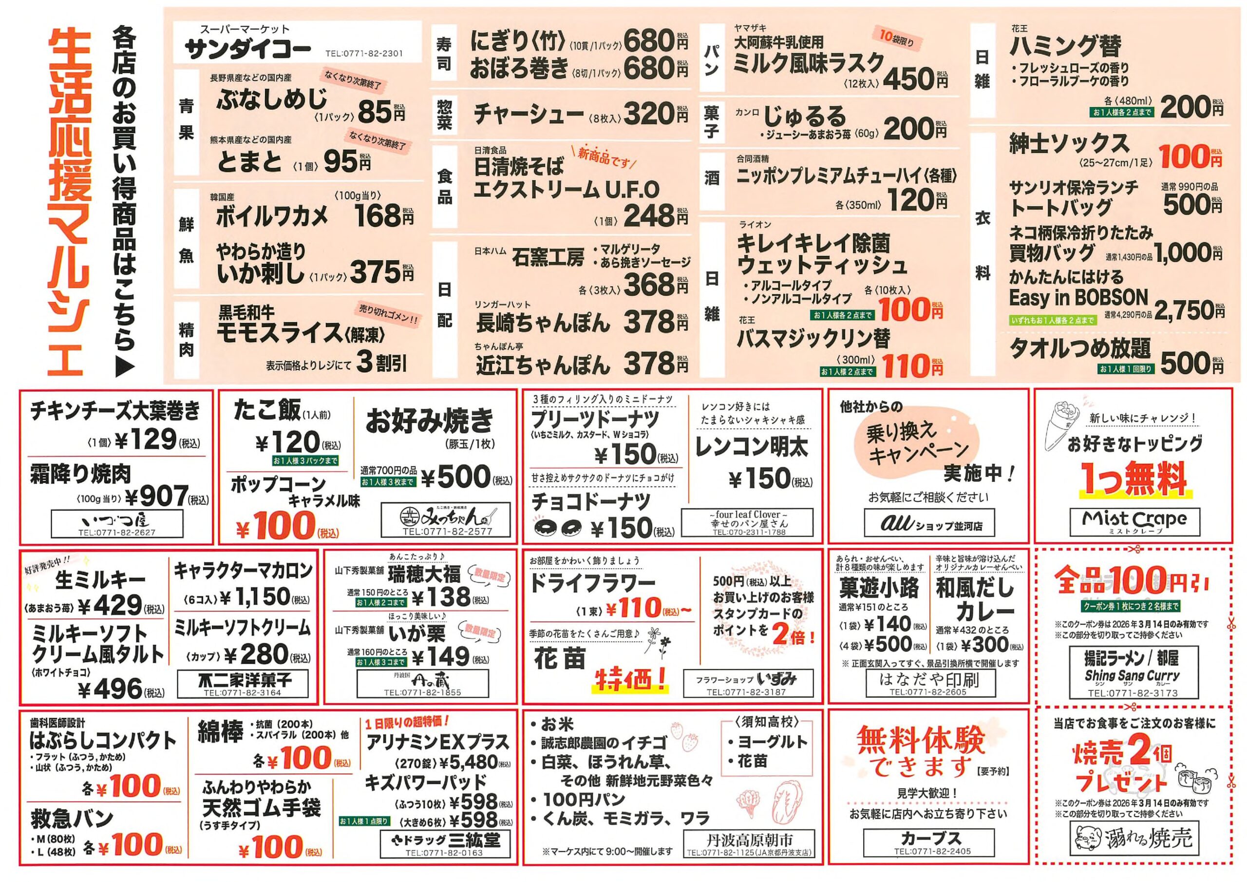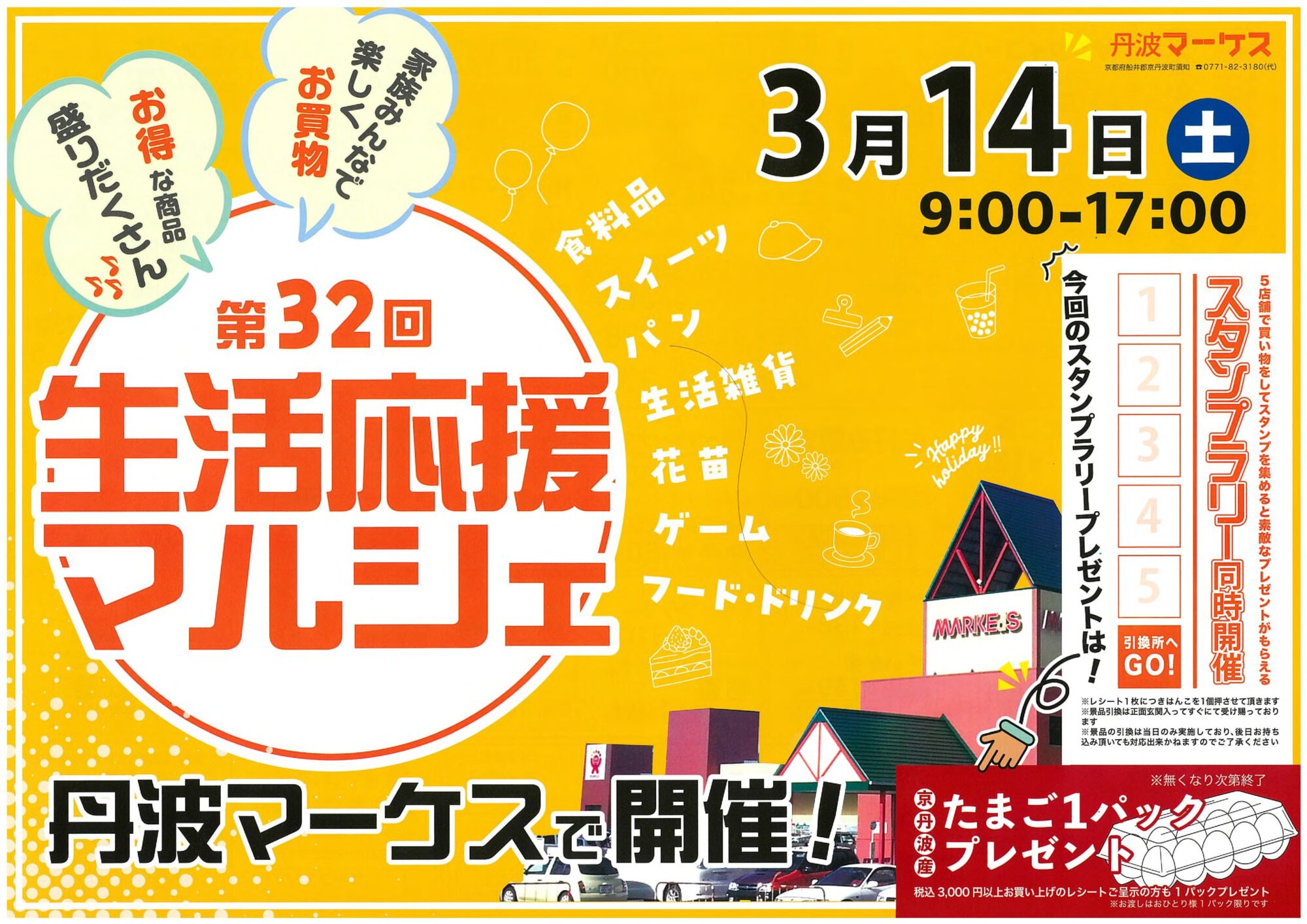3月14日(土)は第32回を数える【丹波マーケス生活応援マルシェ!】を開催します。9:00~17:00まで、家族みんなでお買い物、お得な商品盛りだくさんで皆様のご来店をお待ちしています。