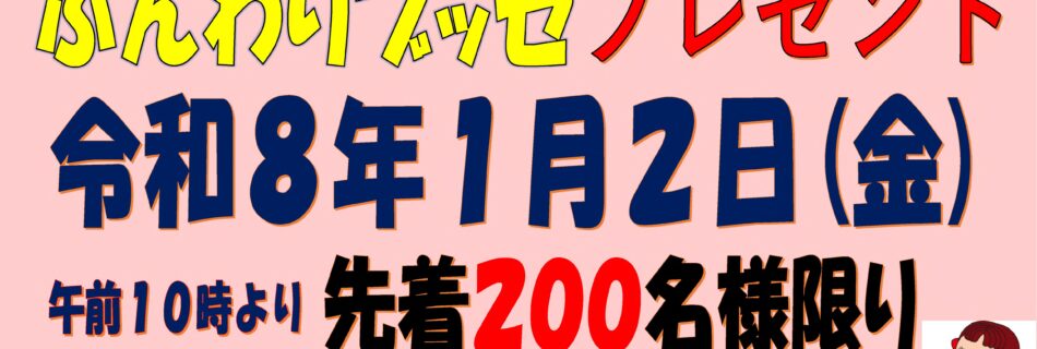 2026年丹波マーケスの初売りを令和8年1月2日(金)10:00から行います。正面玄関にてお一人様1回限りで先着200名様に不二家のふんわりブッセをお配りします。数に限りがあります。なくなり次第終了とさせて頂きますのでご …