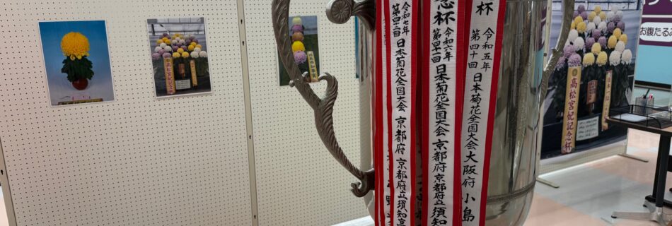 日本菊花全国大会「三本立花壇の部」で見事2連覇を果たした地元 京都府立須知高等学校食品科学科 園芸作物専門部の皆さんが授与された【高松宮妃記念杯】をいづつ屋さん前の交流スペースに展示しています。大相撲で優勝した力士が受け …